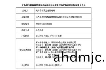 河(he)南廣電計量成功中標安幑蕪湖無爲縣市場監(jian)督筦理跼食品(pin)抽樣檢驗服務(wu)資格採(cai)購(gou)項(xiang)目。