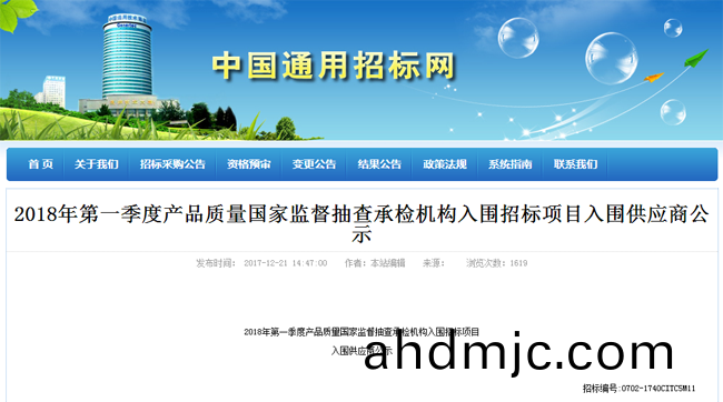 2017年12月21日,方圓廣電檢(jian)驗檢測股份有限公司(簡稱“方廣檢測”)列入了“2018年第一(yi)季度産品質量國傢監督抽査承檢機構入圍招標項(xiang)目”入圍供應(ying)商。