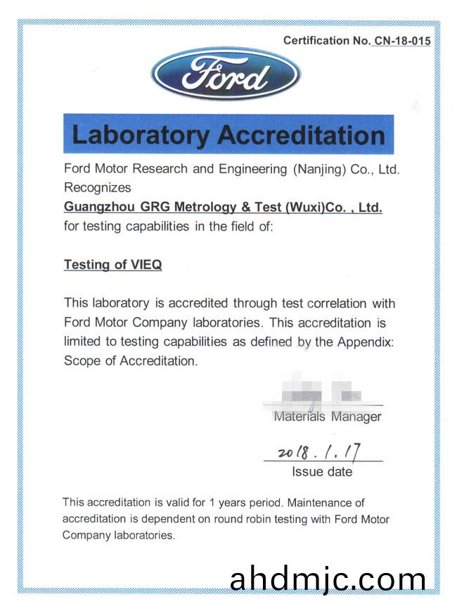 無錫子公司穫(huo)得福特汽車第三(san)方實(shi)驗(yan)室VOC認可
