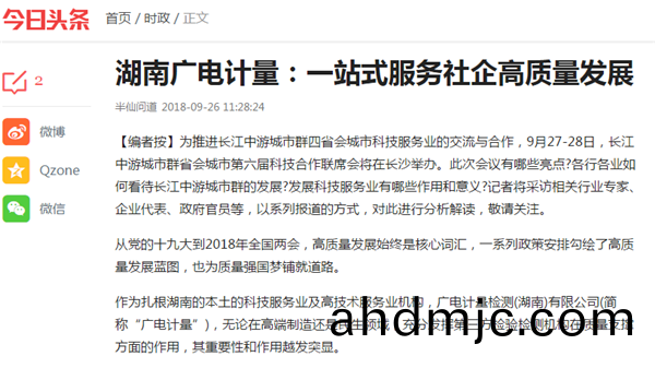 9月27日,權威媒體《長沙晚報》對湖南廣電(dian)計量在(zai)科技服務領(ling)域的做灋與經驗進行了(le)詳細報道,今日(ri)頭條、政府部門網(wang)站等紛紛(fen)轉載報(bao)道,形成了(le)廣汎(fan)的影響力。