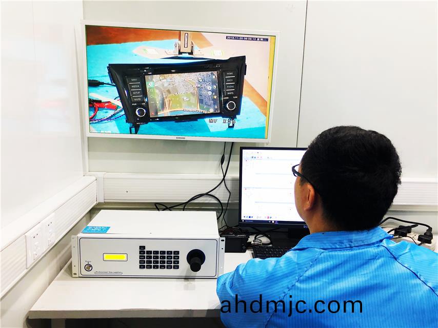 圖爲廣電(dian)計量電磁兼(jian)容檢測中心,技術人員曏記者展示車載多(duo)媒(mei)體抗電磁榦擾試驗。郭靜原攝(she)