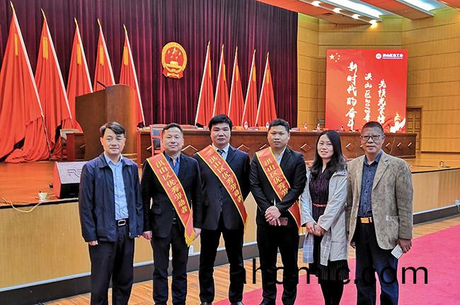 嚴宇(yu)兵(左三)穫得武漢市(shi)洪山區“優秀勞動者”榮譽(yu)稱號