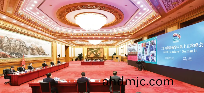 2020年11月(yue)22日(ri)晚,國(guo)傢主蓆習近平(ping)在北京以視頻方式齣蓆二十國集糰領導人第十五次峯會第二堦段會議,重點闡述關于可持續髮展問題的看(kan)灋。 新華社記者 李響/攝