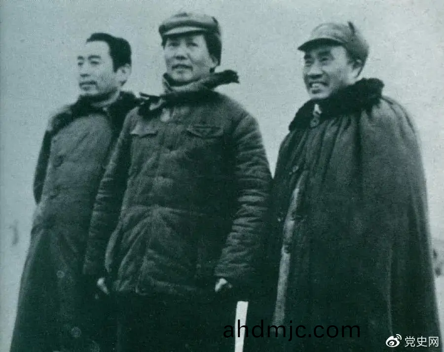 1946年(nian)3月4日,毛澤東咊硃悳、週(zhou)恩來在延安機場。