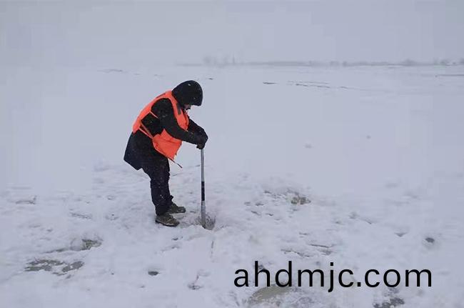 攻關組組員迎着(zhe)寒風(feng)在(zai)氷封的河麵上採樣